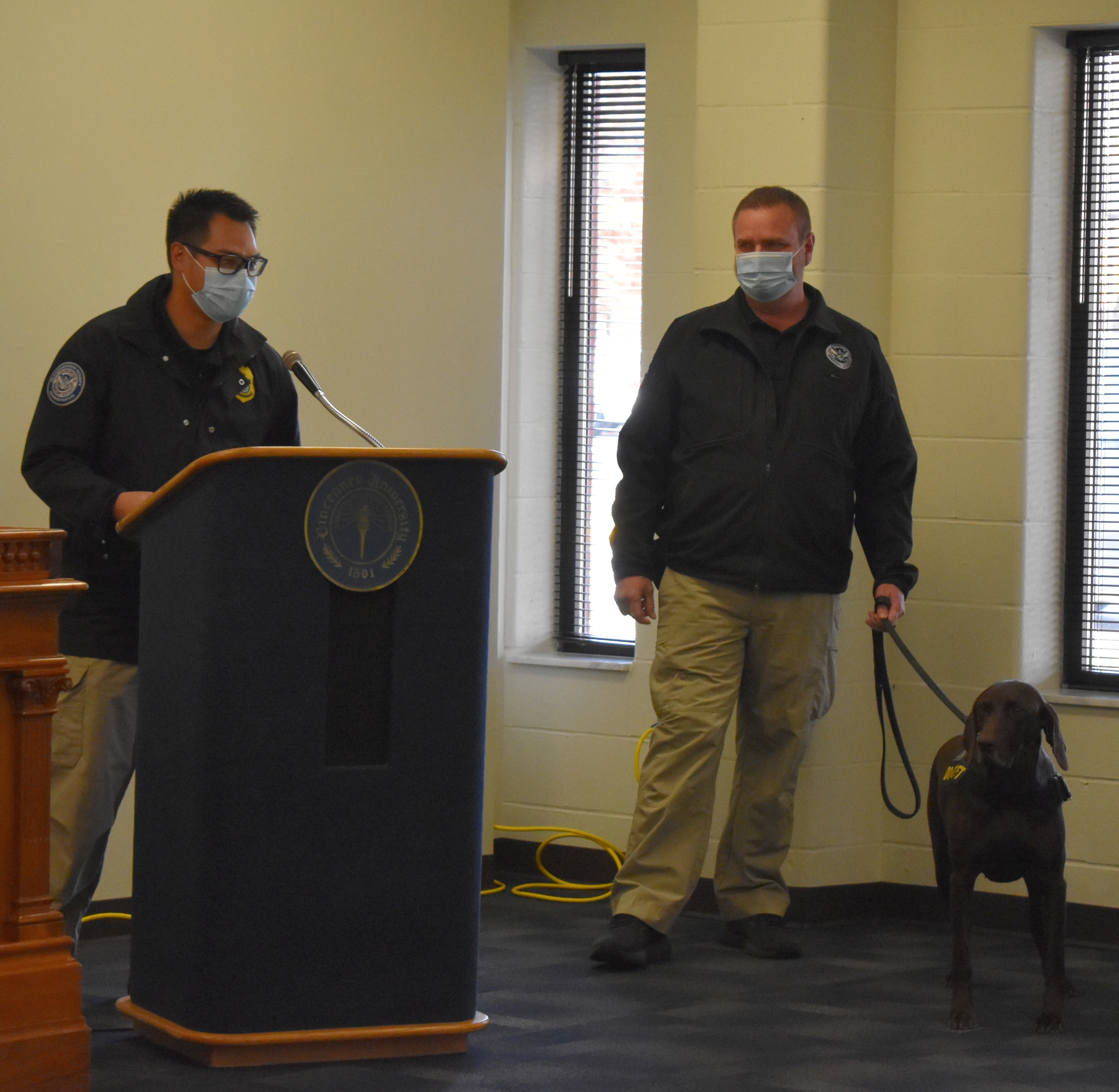 TSA officers Christopher Hudson and Hart were at VU on Nov. 18 to talk to students about potential career opportunities and to demonstrate the explosive detection abilities of the K-9 informative dog.